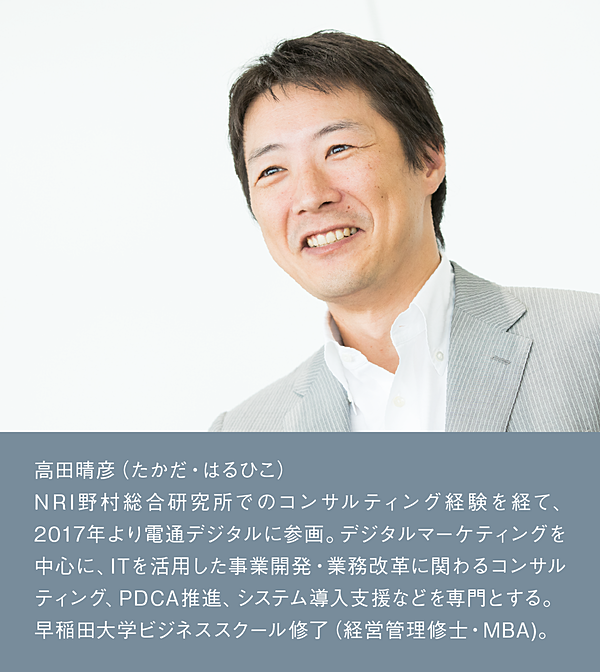 そんな思いを携え、電通デジタルへ移籍したのが、半年ほど前のこと。現在の私の役割は、自社が持つノウハウやテクノロジーを駆使してコンサルティングチームをリードし、顧客企業の課題解決に役立てることです。